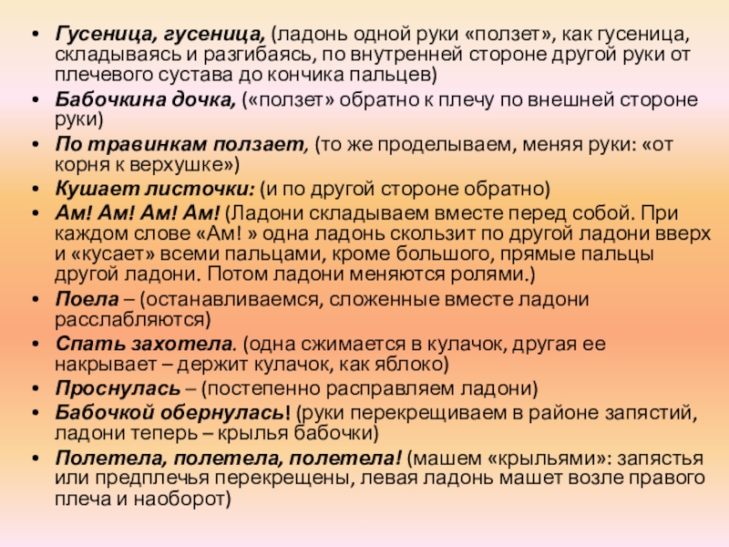 Слайд 13Гусеница, гусеница, (ладонь одной руки «ползет», как гусеница, складываясь и разгибаясь,