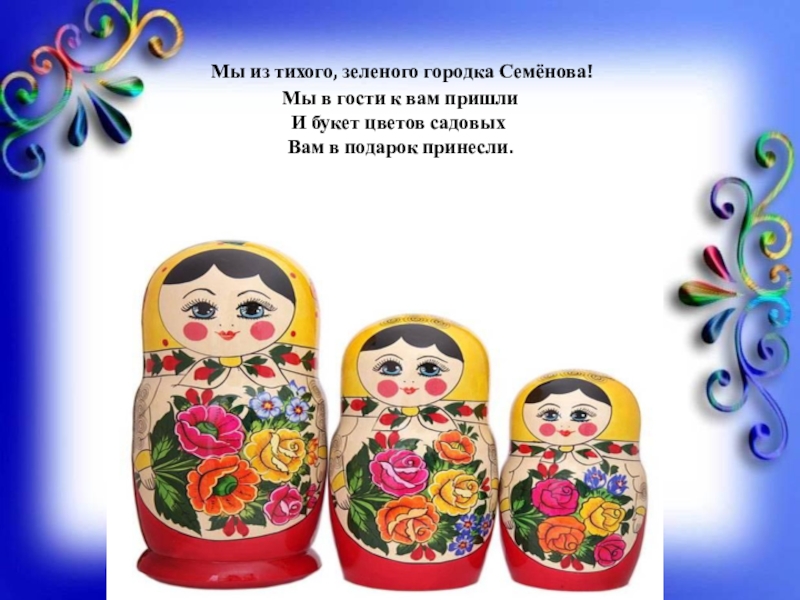 Мы из тихого, зеленого городка Семёнова!  Мы в гости к вам пришли И букет