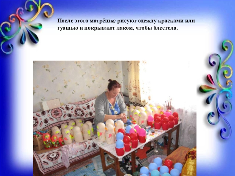 Слайд 11После этого матрёшке рисуют одежду красками или гуашью и покрывают лаком,