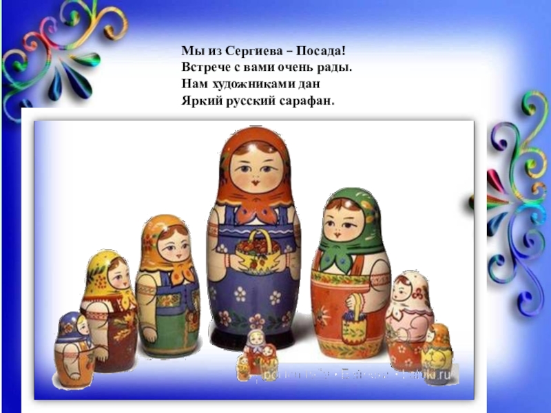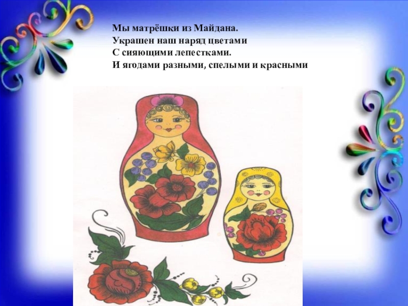 Мы матрёшки из Майдана.Украшен наш наряд цветамиС сияющими лепестками. И ягодами разными, спелыми и красными
