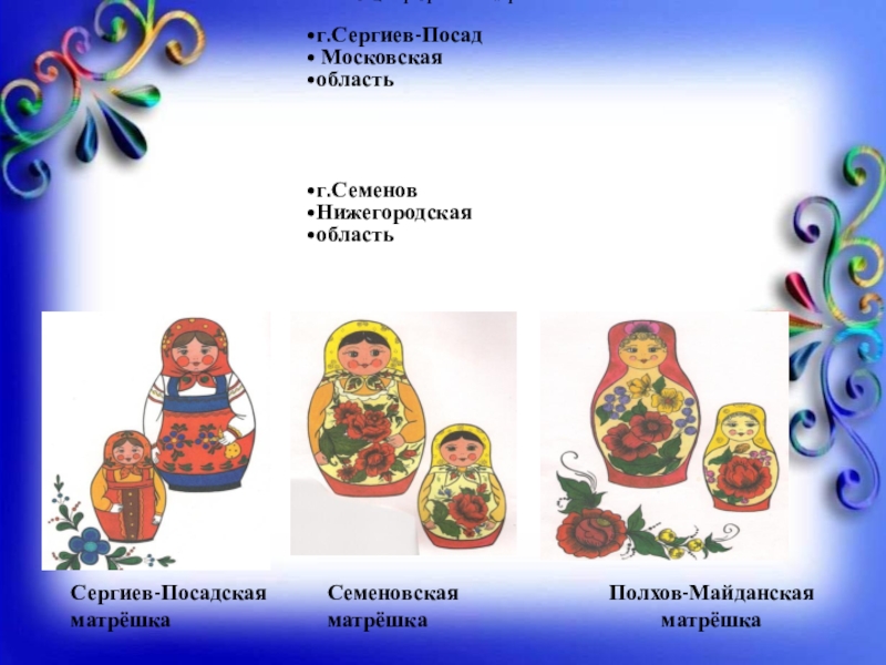 Сергиев-Посадская матрёшкаСеменовская матрёшкаПолхов-Майданская       матрёшка