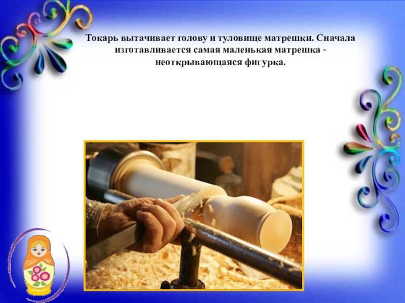 Слайд 9Токарь вытачивает голову и туловище матрешки. Сначала изготавливается самая маленькая матрешка