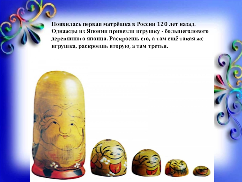 Появилась первая матрёшка в России 120 лет назад. Однажды из Японии привезли игрушку - большеголового деревянного японца. Раскроешь его, а там ещё такая же игрушка, раскроешь вторую, а там третья.