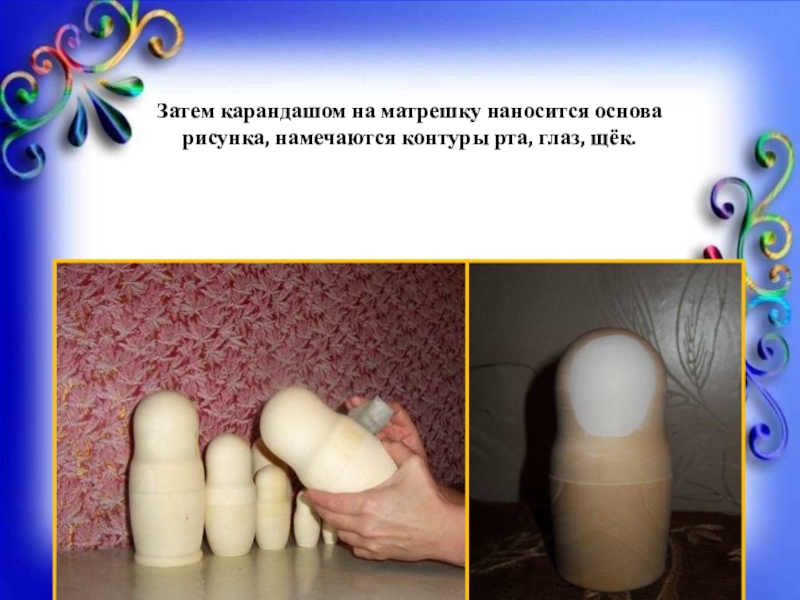 Слайд 10Затем карандашом на матрешку наносится основа рисунка, намечаются контуры рта, глаз,