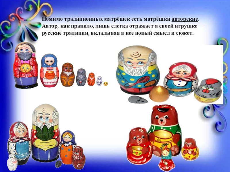 Слайд 12Помимо традиционных матрёшек есть матрёшки авторские. Автор, как правило, лишь слегка
