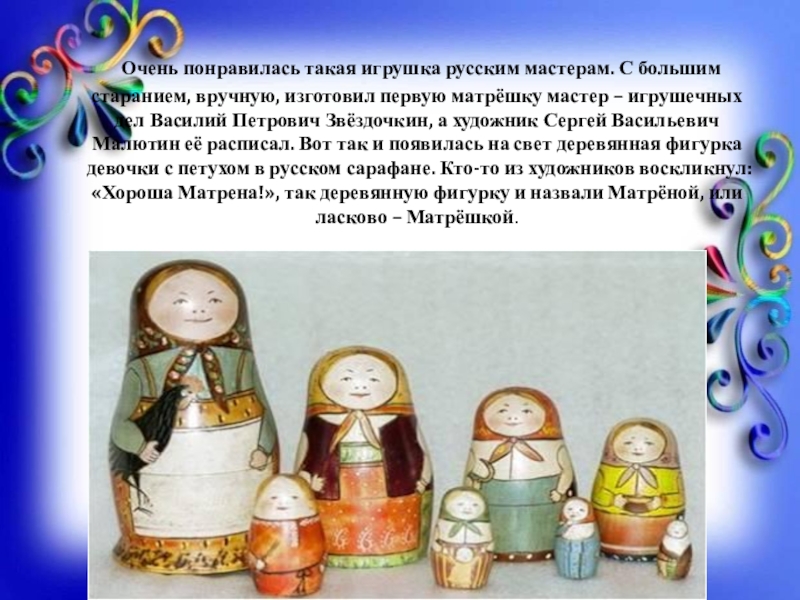 изготовил первую матрёшку мастер – игрушечных дел Василий Петрович Звёздочкин, а художник Сергей Васильевич Малютин её расписал. Вот так и появилась на свет деревянная фигурка девочки с петухом в русском сарафане. Кто-то из художников воскликнул: «Хороша Матрена!», так деревянную фигурку и назвали Матрёной, или ласково – Матрёшкой.