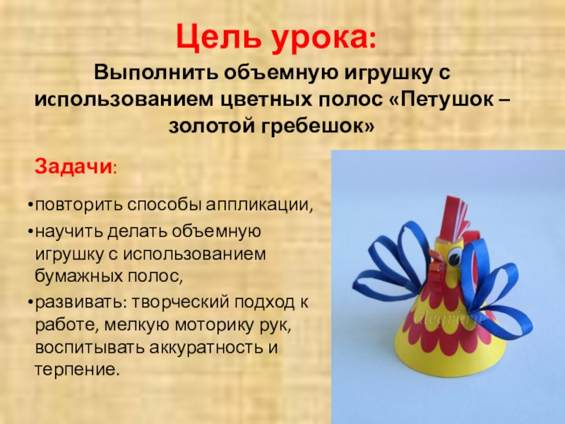 Выполнить объемную игрушку с иcпользованием цветных полос «Петушок – золотой гребешок»