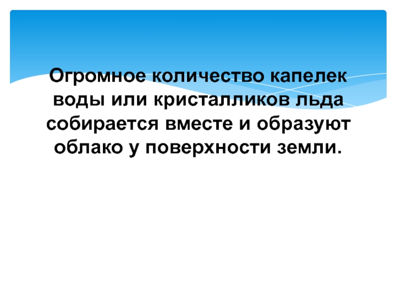 Огромное количество капелек воды или кристалликов льда собирается вместе и образуют облако у поверхности земли.