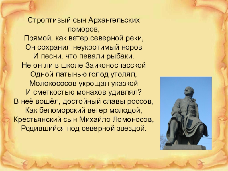 с которым шёл, прячась от леденящего ветра, упрямый помор Ломоносов.