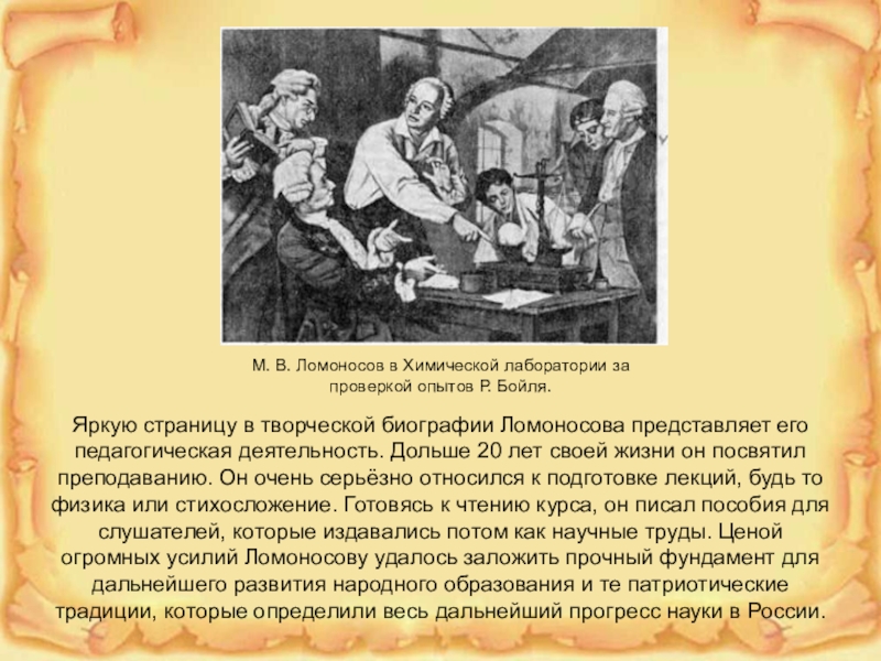 Слайд 76Яркую страницу в творческой биографии Ломоносова представляет его педагогическая деятельность. Дольше