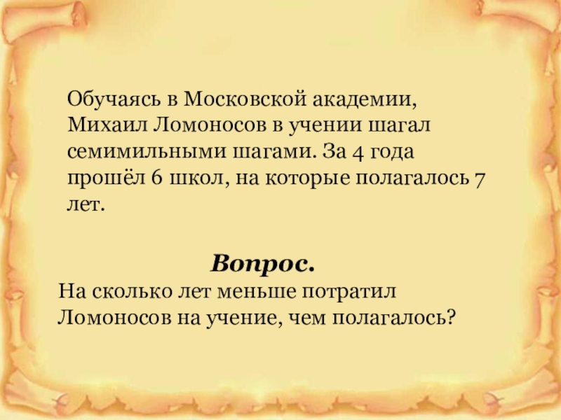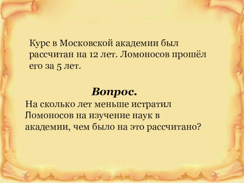 Курс в Московской академии был рассчитан на 12 лет. Ломоносов прошёл
