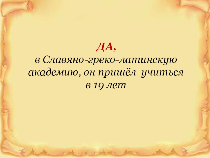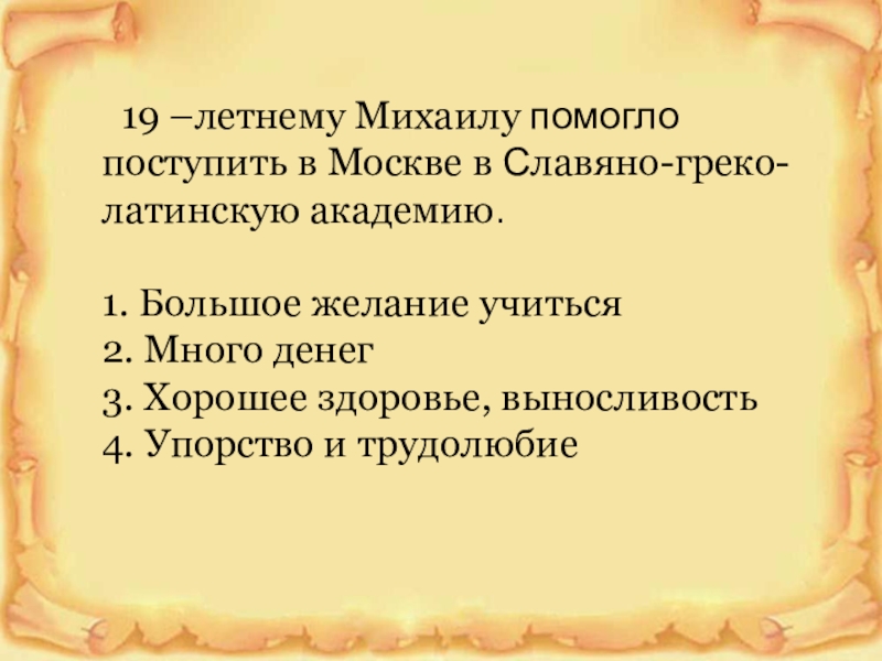 Слайд 20 19 –летнему Михаилу помогло поступить в Москве в Славяно-греко-латинскую академию.