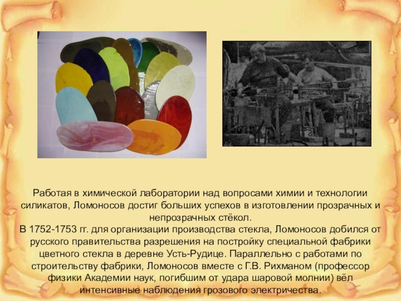В 1752-1753 гг. для организации производства стекла, Ломоносов добился от русского правительства разрешения на постройку специальной фабрики цветного стекла в деревне Усть-Рудице. Параллельно с работами по строительству фабрики, Ломоносов вместе с Г.В. Рихманом (профессор физики Академии наук, погибшим от удара шаровой молнии) вёл интенсивные наблюдения грозового электричества.