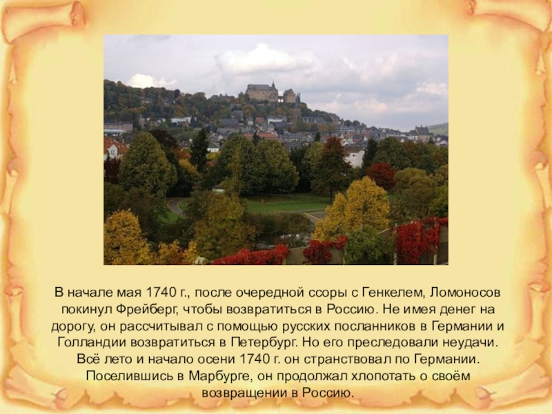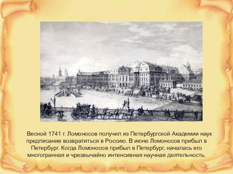Слайд 68Весной 1741 г. Ломоносов получил из Петербургской Академии наук предписание возвратиться