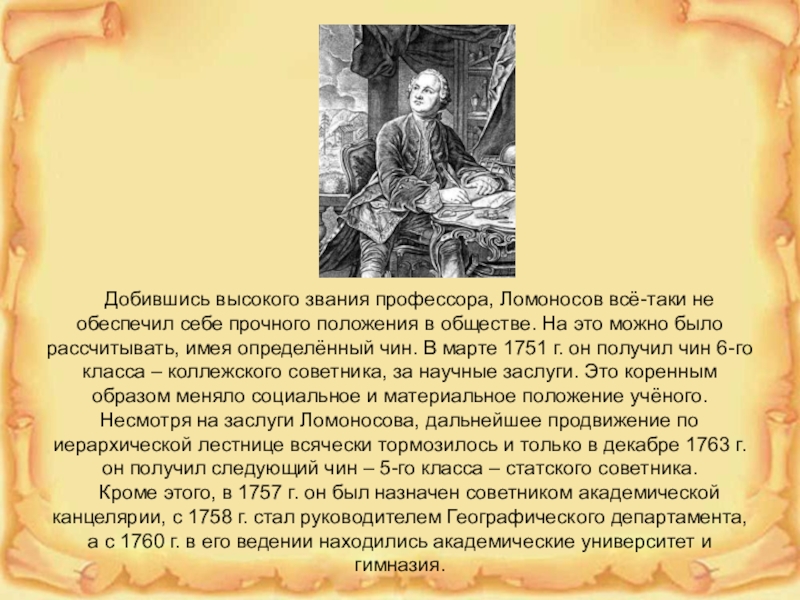 Слайд 73Добившись высокого звания профессора, Ломоносов всё-таки не обеспечил себе прочного положения