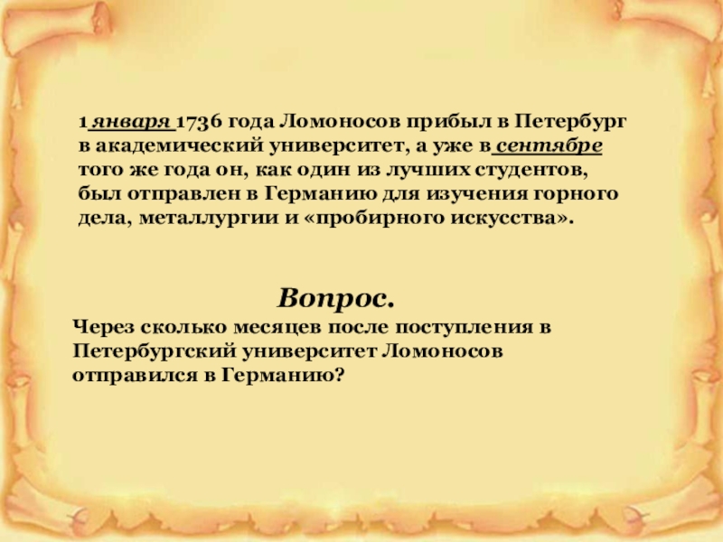в Россию. В июне Ломоносов прибыл в Петербург. Когда Ломоносов прибыл в Петербург, началась его многогранная и чрезвычайно интенсивная научная деятельность.