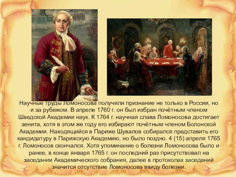 за рубежом. В апреле 1760 г. он был избран почётным членом Шведской Академии наук. К 1764 г. научная слава Ломоносова достигает зенита, хотя в этом же году его избирают почётным членом Болонской Академии. Находящийся в Париже Шувалов собирался представить его кандидатуру в Парижскую Академию, но было поздно. 4 (15) апреля 1765 г. Ломоносов скончался. Хотя упоминание о болезни Ломоносова было и ранее, в конце января 1765 г. он последний раз присутствовал на заседании Академического собрания, далее в протоколах заседаний значится отсутствие Ломоносова ввиду болезни.