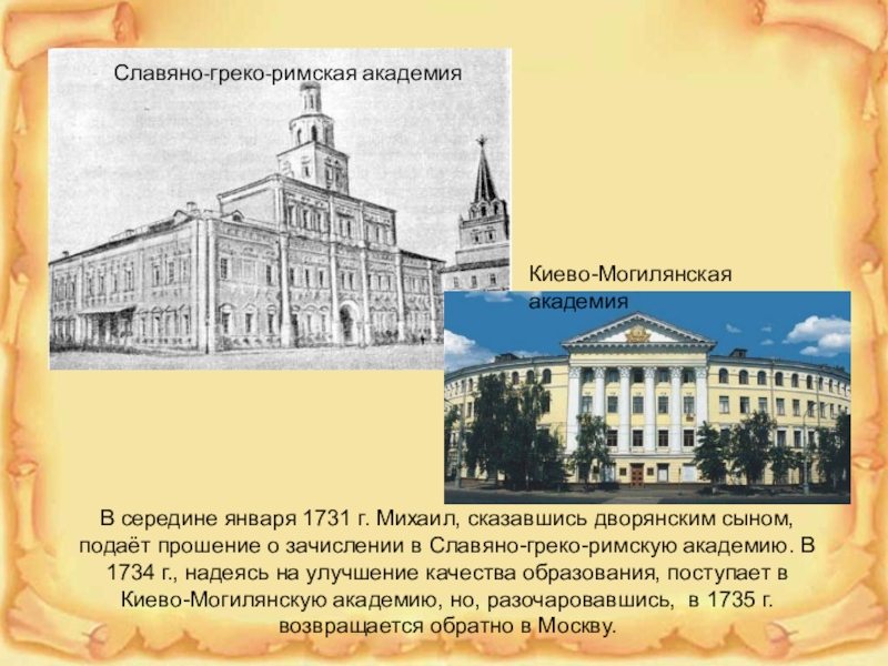 о зачислении в Славяно-греко-римскую академию. В 1734 г., надеясь на улучшение качества образования, поступает в Киево-Могилянскую академию, но, разочаровавшись, в 1735 г. возвращается обратно в Москву.