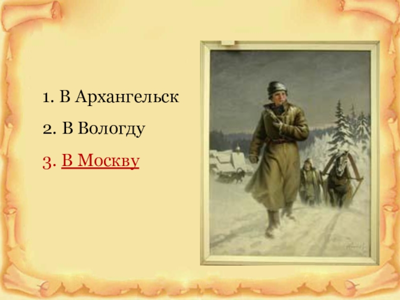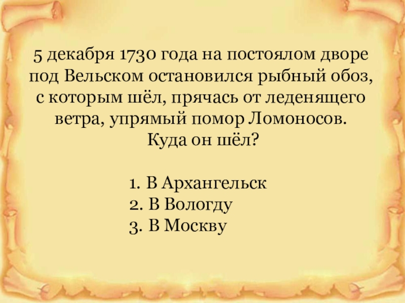 Слайд 27 Когда Ломоносов ушел с рыбным обозом в Москву,