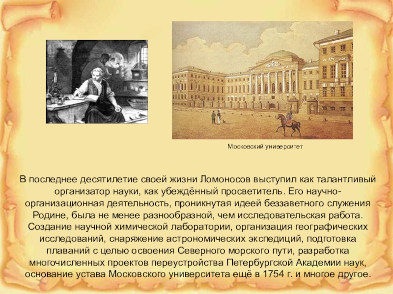 как убеждённый просветитель. Его научно-организационная деятельность, проникнутая идеей беззаветного служения Родине, была не менее разнообразной, чем исследовательская работа. Создание научной химической лаборатории, организация географических исследований, снаряжение астрономических экспедиций, подготовка плаваний с целью освоения Северного морского пути, разработка многочисленных проектов переустройства Петербургской Академии наук, основание устава Московского университета ещё в 1754 г. и многое другое.