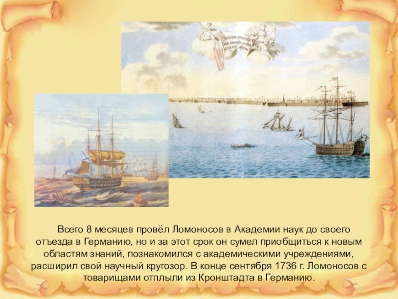 Слайд 64Всего 8 месяцев провёл Ломоносов в Академии наук до своего отъезда