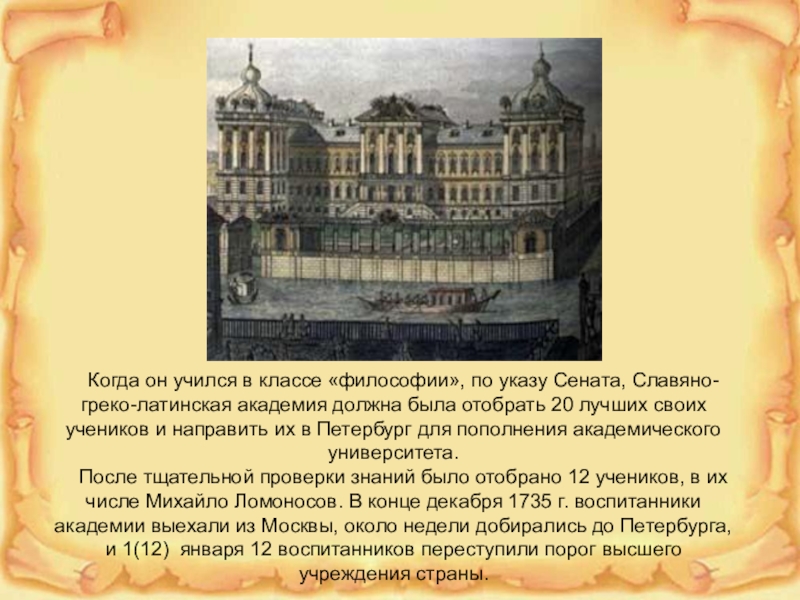 После тщательной проверки знаний было отобрано 12 учеников, в их числе Михайло Ломоносов. В конце декабря 1735 г. воспитанники академии выехали из Москвы, около недели добирались до Петербурга, и 1(12) января 12 воспитанников переступили порог высшего учреждения страны.
