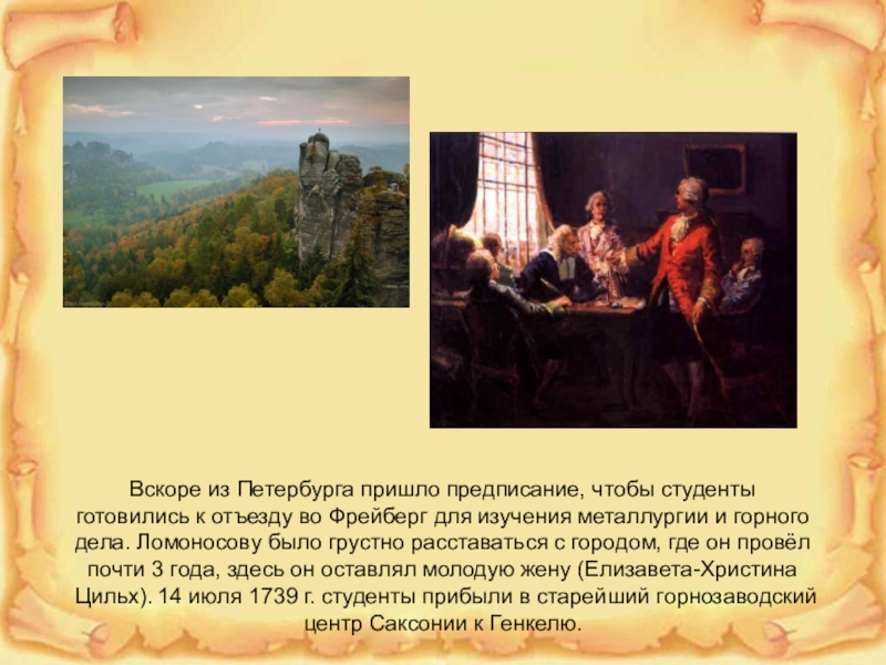 Фрейберг для изучения металлургии и горного дела. Ломоносову было грустно расставаться с городом, где он провёл почти 3 года, здесь он оставлял молодую жену (Елизавета-Христина Цильх). 14 июля 1739 г. студенты прибыли в старейший горнозаводский центр Саксонии к Генкелю.