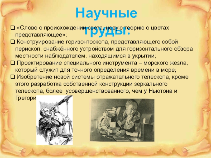 Изобретение новой системы отражательного телескопа, кроме этого разработка собственной конструкции зеркального телескопа, более усовершенствованного, чем у Ньютона и Грегори.