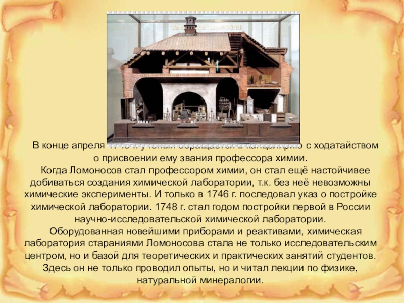 Когда Ломоносов стал профессором химии, он стал ещё настойчивее добиваться создания химической лаборатории, т.к. без неё невозможны химические эксперименты. И только в 1746 г. последовал указ о постройке химической лаборатории. 1748 г. стал годом постройки первой в России научно-исследовательской химической лаборатории.