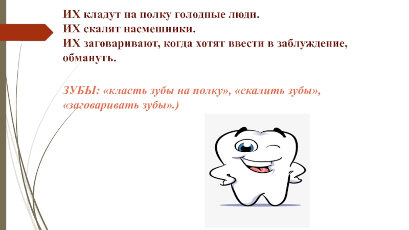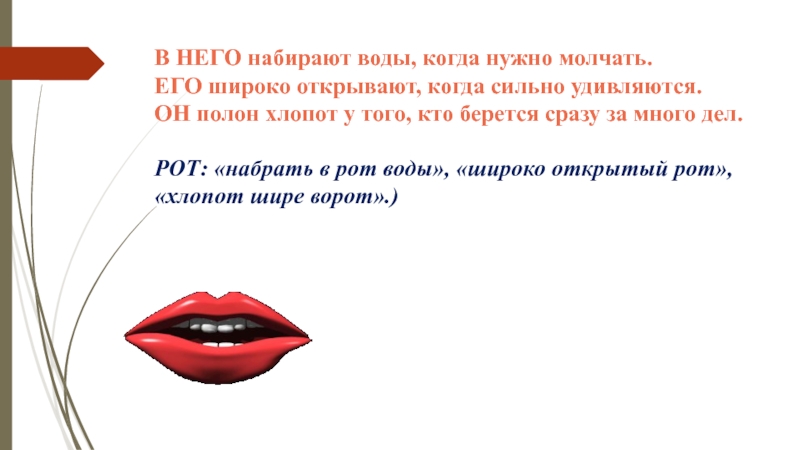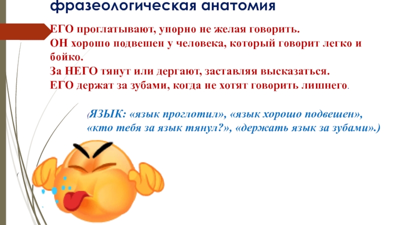 (ЯЗЫК: «язык проглотил», «язык хорошо подвешен», «кто тебя за язык тянул?», «держать язык за зубами».)