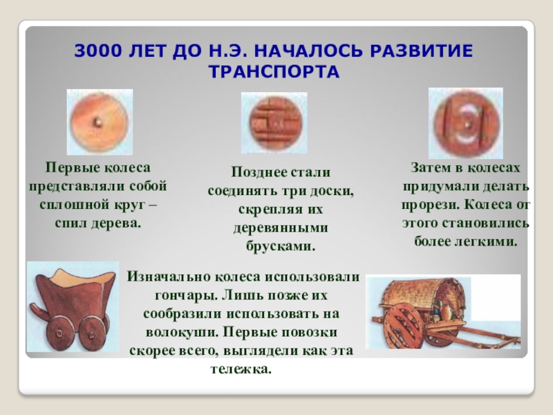 Изначально колеса использовали гончары. Лишь позже их сообразили использовать на волокуши. Первые повозки скорее всего, выглядели как эта тележка.