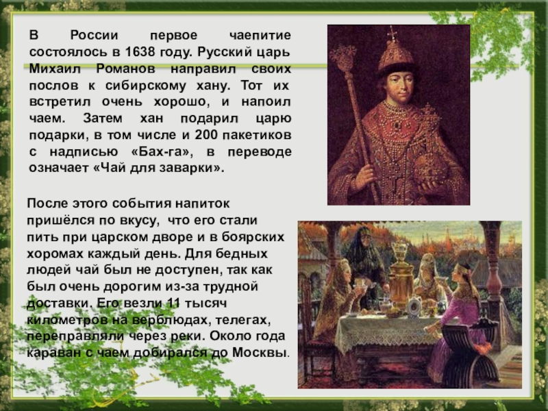 После этого события напиток пришёлся по вкусу, что его стали пить при царском дворе и в боярских хоромах каждый день. Для бедных людей чай был не доступен, так как был очень дорогим из-за трудной доставки. Его везли 11 тысяч километров на верблюдах, телегах, переправляли через реки. Около года караван с чаем добирался до Москвы.