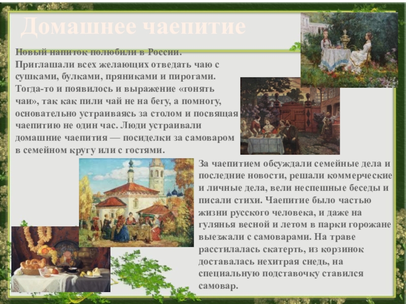 За чаепитием обсуждали семейные дела и последние новости, решали коммерческие и личные дела, вели неспешные беседы и писали стихи. Чаепитие было частью жизни русского человека, и даже на гулянья весной и летом в парки горожане выезжали с самоварами. На траве расстилалась скатерть, из корзинок доставалась нехитрая снедь, на специальную подставочку ставился самовар.