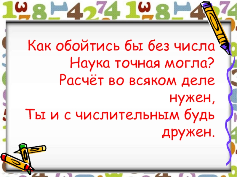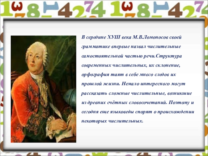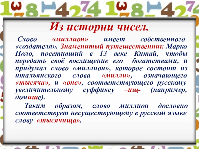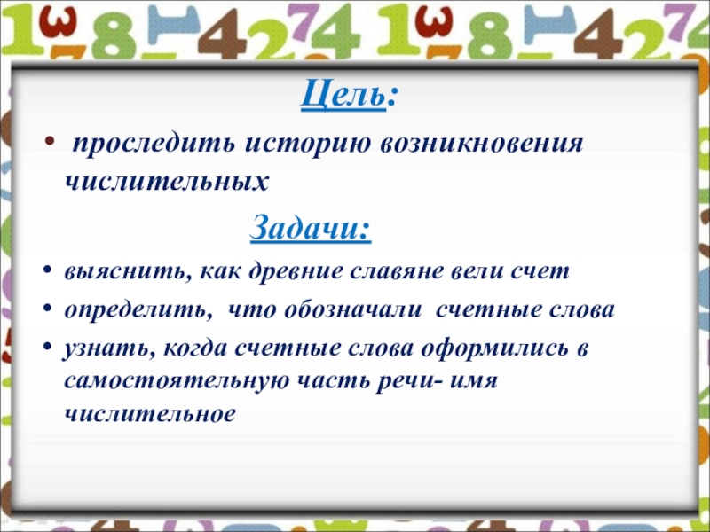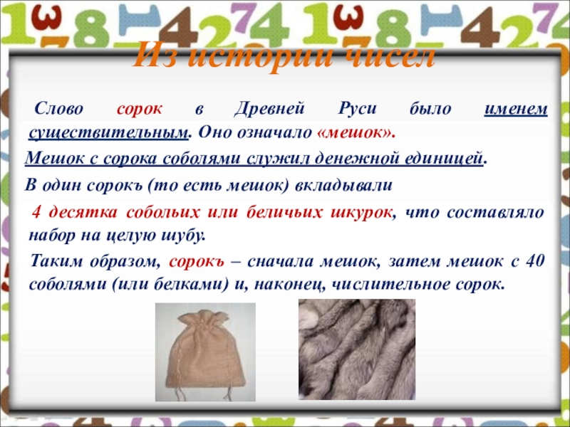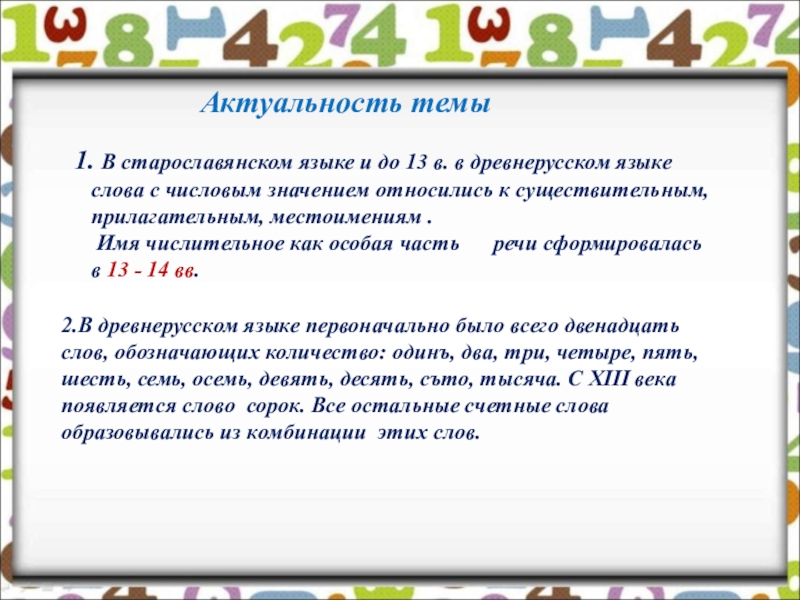 2.В древнерусском языке первоначально было всего двенадцать слов, обозначающих количество: одинъ, два, три, четыре, пять, шесть, семь, осемь, девять, десять, съто, тысяча. С XIII века появляется слово сорок. Все остальные счетные слова образовывались из комбинации этих слов.