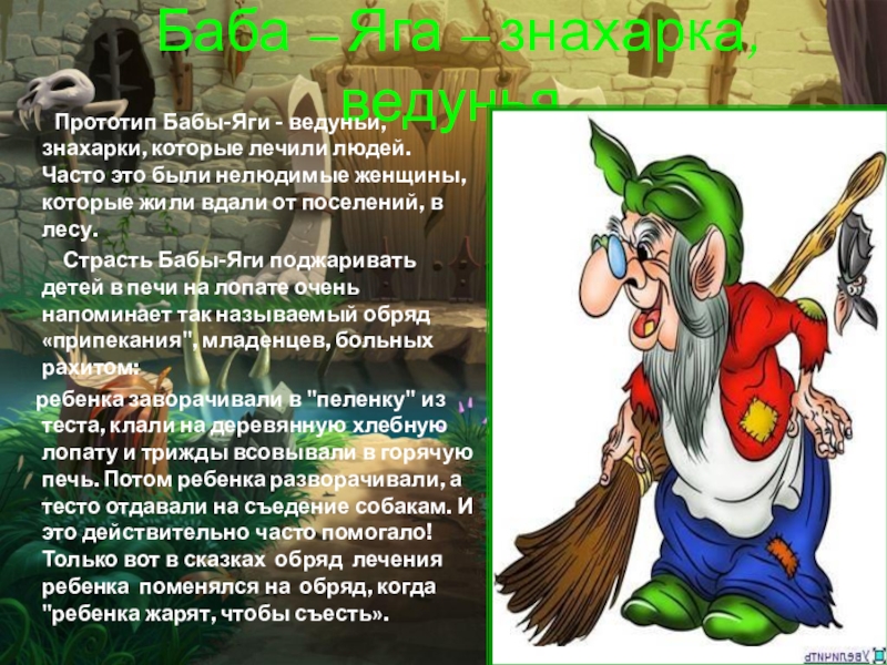 Слайд 15Баба – Яга – знахарка, ведунья.