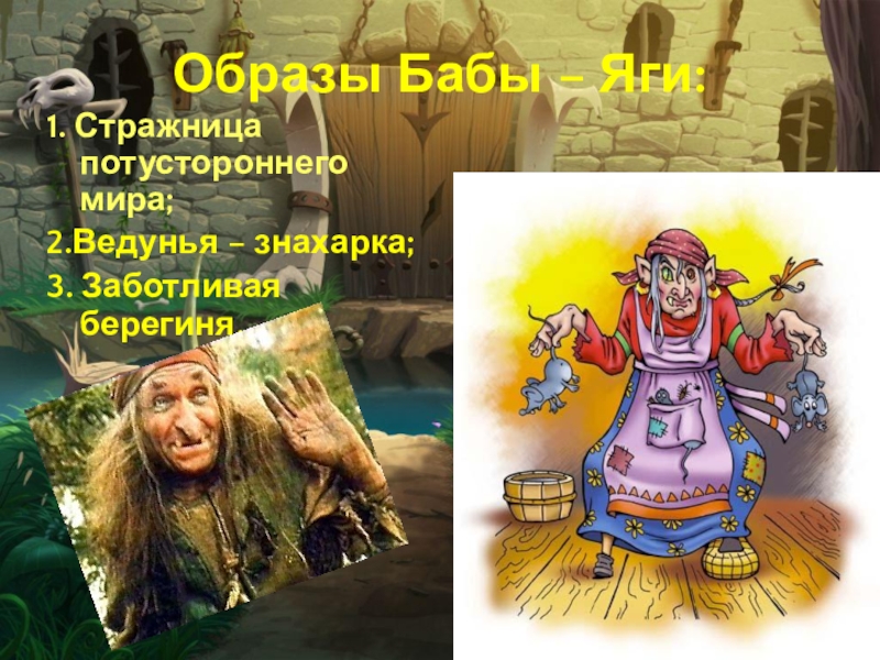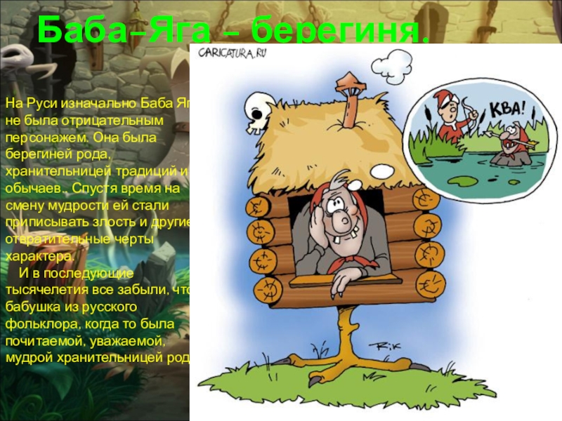 не была отрицательным персонажем. Она была берегиней рода, хранительницей традиций и обычаев.. Спустя время на смену мудрости ей стали приписывать злость и другие отвратительные черты характера.