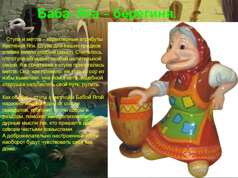 – характерные атрибуты Костяной Яги. Ступа для наших предков славян имела особый смысл. Считалось, что ступа обладает особой целительной силой. А в сочетание к ступе прилагалась метла. Она, как правило, не только сор из избы выметает, она помогает волшебной старушке направлять свой путь, рулить.