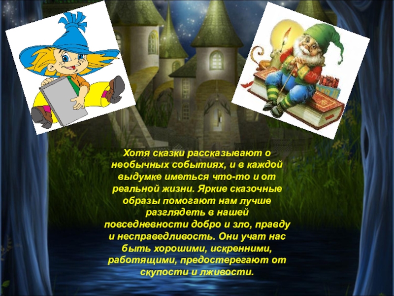 что-то и от реальной жизни. Яркие сказочные образы помогают нам лучше разглядеть в нашей повседневности добро и зло, правду и несправедливость. Они учат нас быть хорошими, искренними, работящими, предостерегают от скупости и лживости.