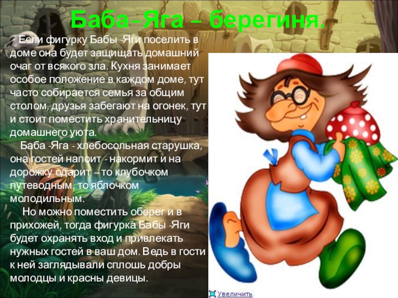 Баба -Яга - хлебосольная старушка, она гостей напоит - накормит и на дорожку одарит – то клубочком путеводным, то яблочком молодильным.