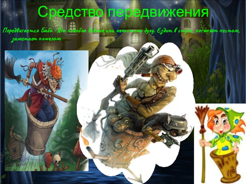 Передвигается Баба -Яга подобно ведьме или нечистому духу. Ездит в