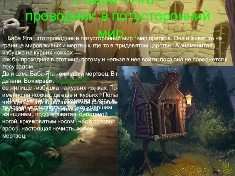 Да и сама Баба-Яга - оживший мертвец. В пользу этой гипотезы говорят такие детали. Во-первых,