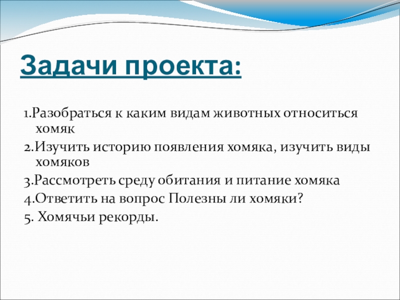 Задачи проекта:1.Разобраться к каким видам животных относиться хомяк2.Изучить историю появления хомяка, изучить виды хомяков3.Рассмотреть среду обитания и
