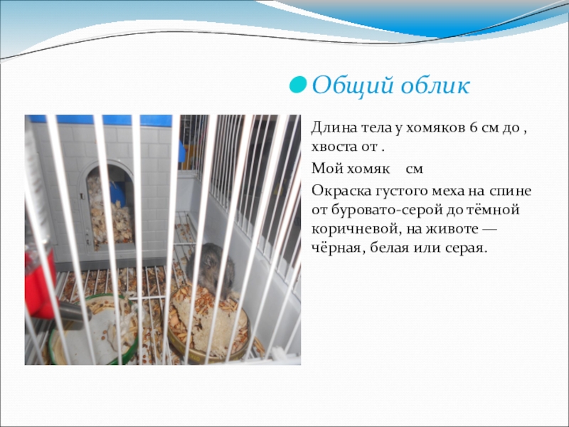 Общий облик  Длина тела у хомяков 6 см до , хвоста от . Мой хомяк