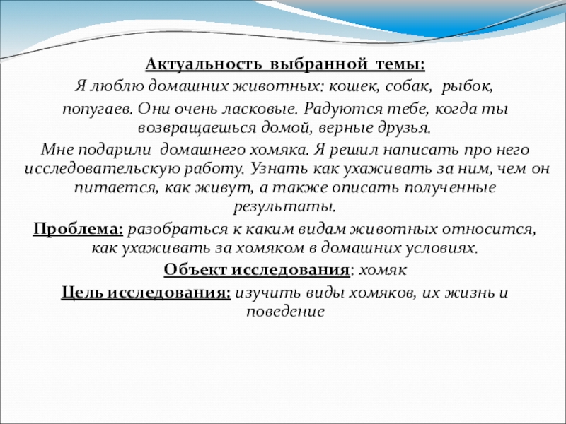 Мне подарили домашнего хомяка. Я решил написать про него исследовательскую работу. Узнать как ухаживать за ним, чем он питается, как живут, а также описать полученные результаты.
