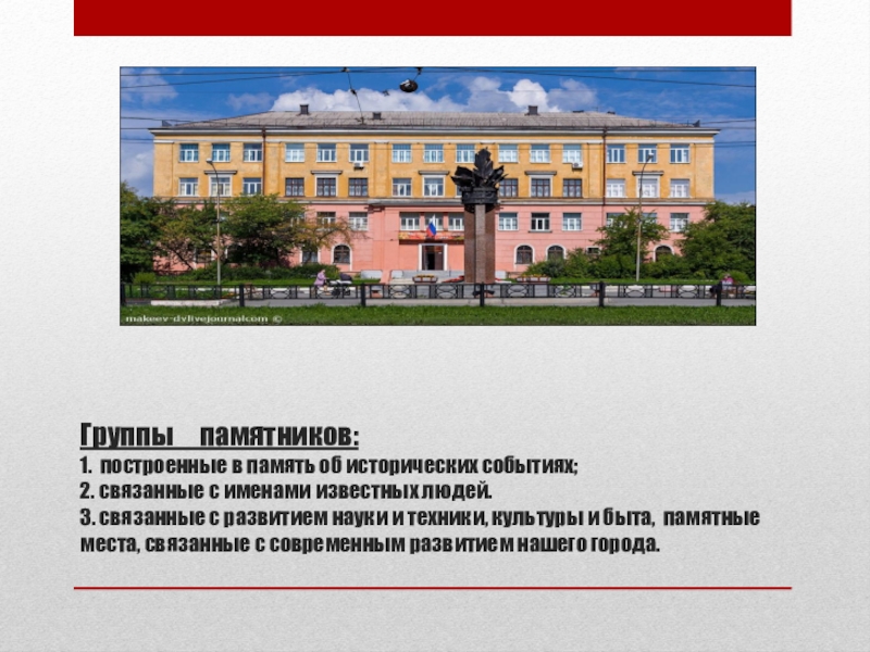 Слайд 11Группы памятников: 1. построенные в память об исторических событиях; 2. связанные
