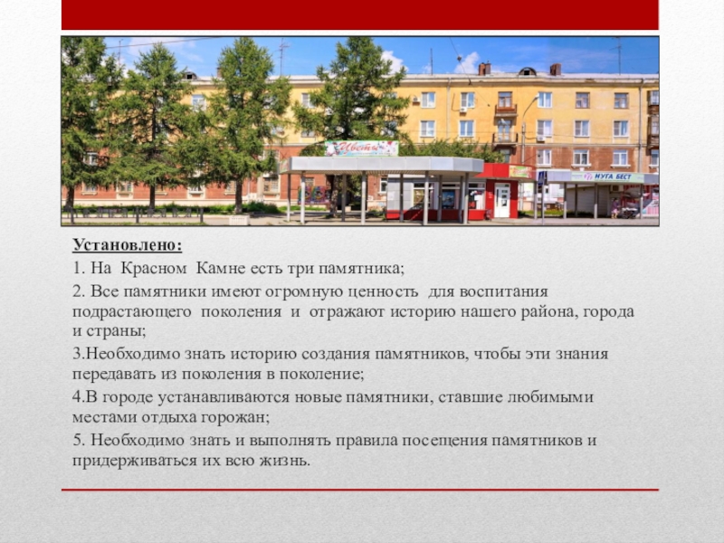 Установлено:1. На Красном Камне есть три памятника;2. Все памятники имеют огромную ценность для воспитания подрастающего поколения и