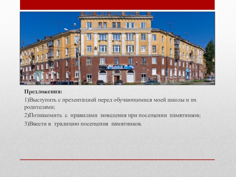 Предложения:1)Выступить с презентацией перед обучающимися моей школы и их родителями; 2)Познакомить с правилами поведения при посещении памятников;3)Ввести