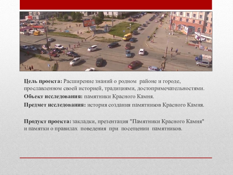 Цель проекта: Расширение знаний о родном районе и городе, прославленном своей историей, традициями, достопримечательностями.Объект исследования: памятники Красного