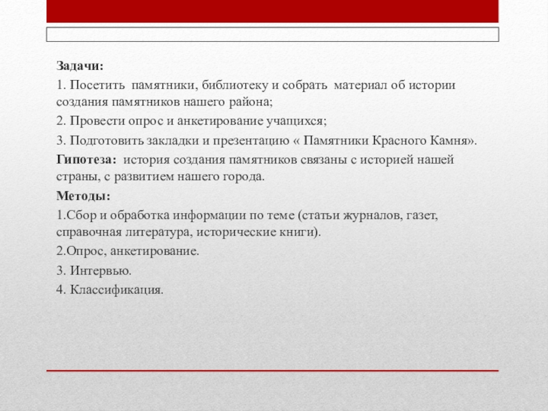 Презентация, доклад к исследовательскому проекту на тему: Памятники Красного Камня ( 2 класс).