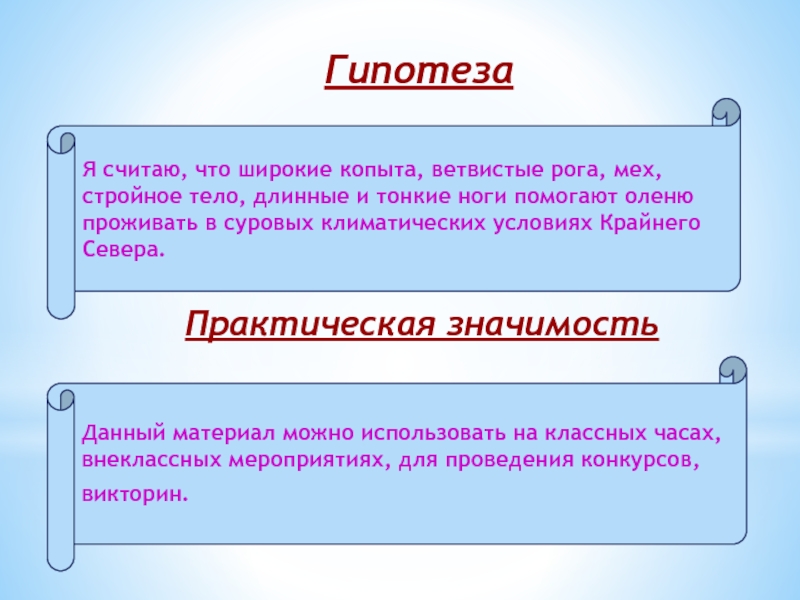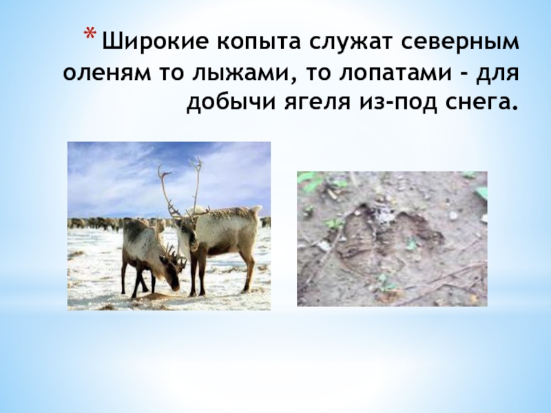Я считаю, что широкие копыта, ветвистые рога, мех, стройное тело, длинные и тонкие ноги помогают оленю проживать в суровых климатических условиях Крайнего Севера.
